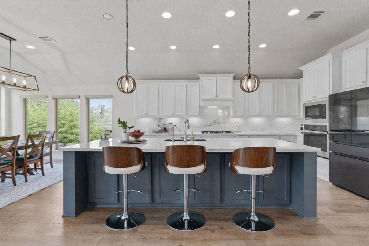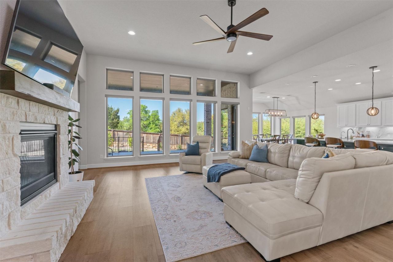 Welcome to this stunning Perry Home, situated on a premium corner lot backing to serene green space with direct trail access in the highly sought-after Rancho Sienna community. Zoned to top-rated schools & thoughtfully upgraded, this home offers peace of mind with a new roof (2023), a Tesla EV charger in the 3-car garage, & a whole-house water softener paired with a reverse osmosis system for exceptional water quality. Inside, youre welcomed by an open-concept layout featuring soaring 12-foot ceilings, grand 8-foot doors, & picture windows that capture tranquil greenbelt views, complemented by motorized shades for effortless light & privacy control. Elegant wood-like luxury vinyl plank flooring flows through the main living areas. The living room is anchored by a stone fireplace & seamlessly connects to the kitchen with quartz countertops, a large island with bar seating, crisp white cabinetry with pull-out drawers, a marble-pattern backsplash, black & stainless steel appliances, & a custom walk-in pantry with built-ins. Enjoy movie nights in the theatre room or work from home in the stylish office with glass doors & floating shelves. The primary suite is highlighted by a dramatic 13-foot cathedral ceiling & a spa-like ensuite with dual vanities, a soaking tub, a separate shower with seating, & a spacious walk-in closet. Three additional bedrooms offer incredible flexibility, each with walk-in closets?one featuring an ensuite bath, while the others share a convenient Jack-&-Jill bath. Step outside to a fenced backyard with a large covered patio, perfect for relaxing or entertaining. Located within walking distance to the neighborhood elementary school & just steps from exceptional community amenities, including a pool, splash pad, park, playground, clubhouse, fitness center, trails, & pond. This home also offers unbeatable convenience with HEB just 3 minutes away & Target & Costco is just a short drive away. With easy access to 183 & I-35, commuting is a breeze.