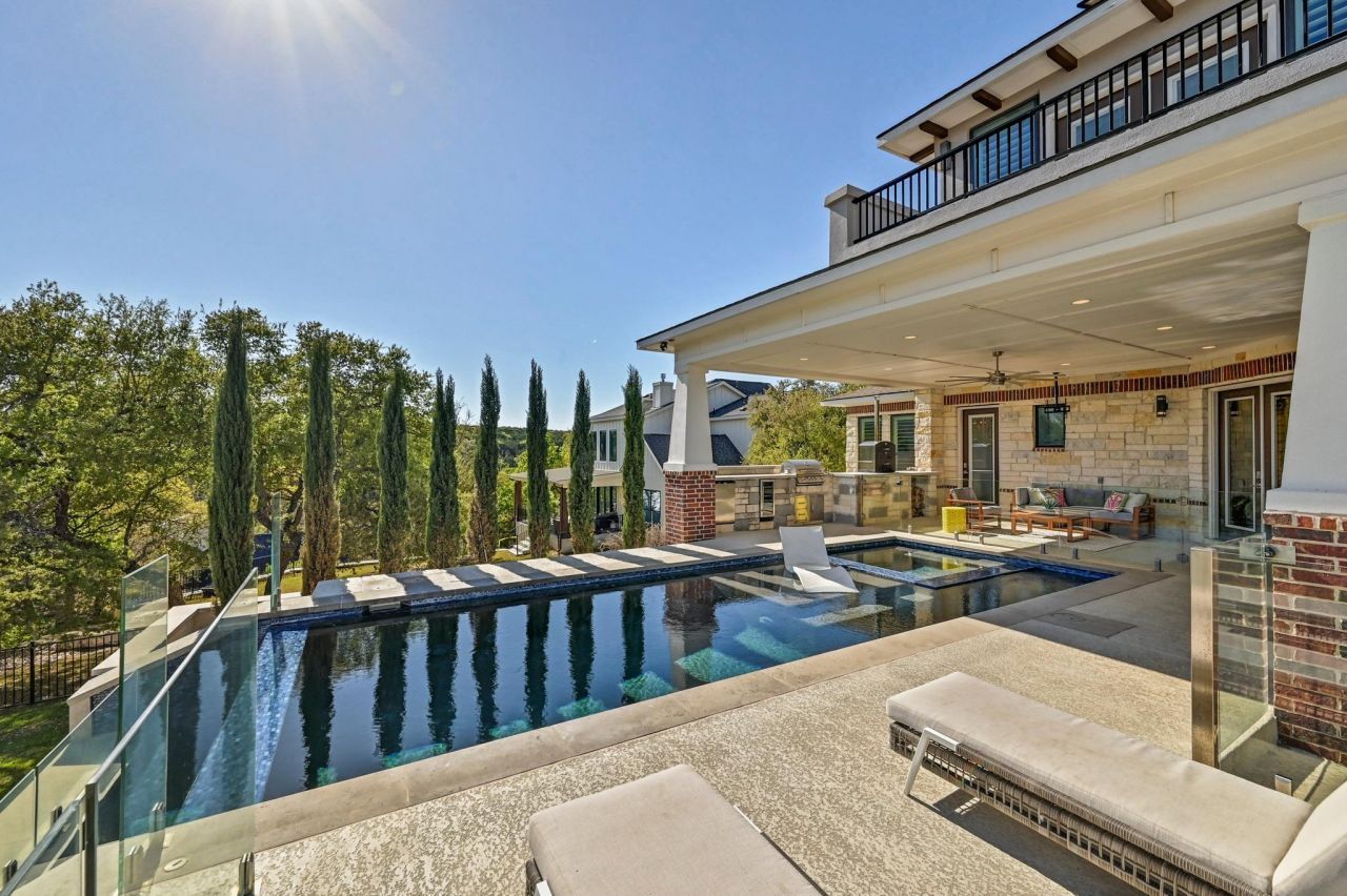 Set on a full acre with sweeping panoramic views of Lake Georgetown, Twin Springs Preserve, and the surrounding Hill Country, this home stands out in all the right ways. The exterior makes a strong first impression with clean contemporary lines, limestone detailing, and a presence that feels substantial and inviting. Inside, the main floor opens to a bright, easy flow between the kitchen, dining, and living areas, all designed to make the most of the setting. The kitchen sits at the center of it all, pairing style and function with an oversized island, marble countertops, 48-inch dual fuel Bertazzoni range, and more! In the living room, double French doors open wide to a backyard setup that feels more like a private retreat. Theres an extended covered patio with an outdoor kitchen, plenty of space to lounge, and a resort-style infinity edge pool that immediately pulls your eye toward the view. From there, the yard steps down to a separate fire pit area and expansive yard backing to the preserve. Its a setup that feels private, peaceful, and designed to enjoy year-round. The main level also includes a stunning primary suite and ensuite, along with a private office. Upstairs, a game room opens to a balcony with unobstructed views of Lake Georgetown, while an additional flex room and 3 spacious bedrooms add even more versatility. Three of the four bedrooms have en-suite baths, making the layout especially well-suited for guests or multi-gen living. A 34x24 four-car garage and large carport provide plenty of room for vehicles and storage, while a Tesla Powerwall and solar panels add energy efficiency and everyday peace of mind. Beyond the property, theres a stocked fishing pond at the end of the street, trail access to Lake Georgetown, and Russell Park with boat launch just 1.6 miles away. This is the kind of home that doesnt just offer great views, it was designed to make the most of them, with a layout and outdoor spaces that make every day feel pretty incredible.