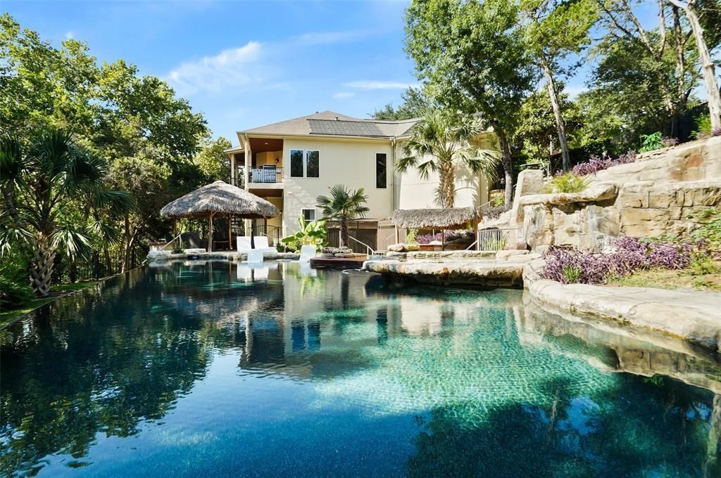 Immerse yourself in luxury with this exquisite 4-bedroom, 3.5-bathroom residence, offering 4,240 square feet of opulent living space. This exceptional home features a self-contained mother-in-law suite and a wrap-around deck, designed for the ultimate living experience. Recent updates include a new roof, dishwasher and gutters. Set on a tranquil 3/4-acre lot along the Yaupon Creek, the property provides a private retreat in the heart of Lakeway. The backyard is an entertainers dream, showcasing a custom-designed, solar-heated infinity pool with a hot tub and swim-up bar. Relax and entertain in style at the poolside outdoor kitchen, complete with two cabanas and a Jenn-Air grill. Inside, the home is equally impressive. The media room is a cinematic escape with state of the art techtonic motion seating, a new projection unit, and remarkable surround sound. The main floor primary suite is a sanctuary of elegance, featuring coffered ceilings. The gourmet kitchen boasts granite countertops, stainless steel appliances,and a new dishwasher. Recent outdoor updates include extensive landscaping that enhances curb appeal, upgrades to the outdoor kitchens and cabanas, and a new roof. This property offers a harmonious blend of luxury, privacy, and functionality, making it the ideal choice for your new home. Welcome to your tropical paradise!