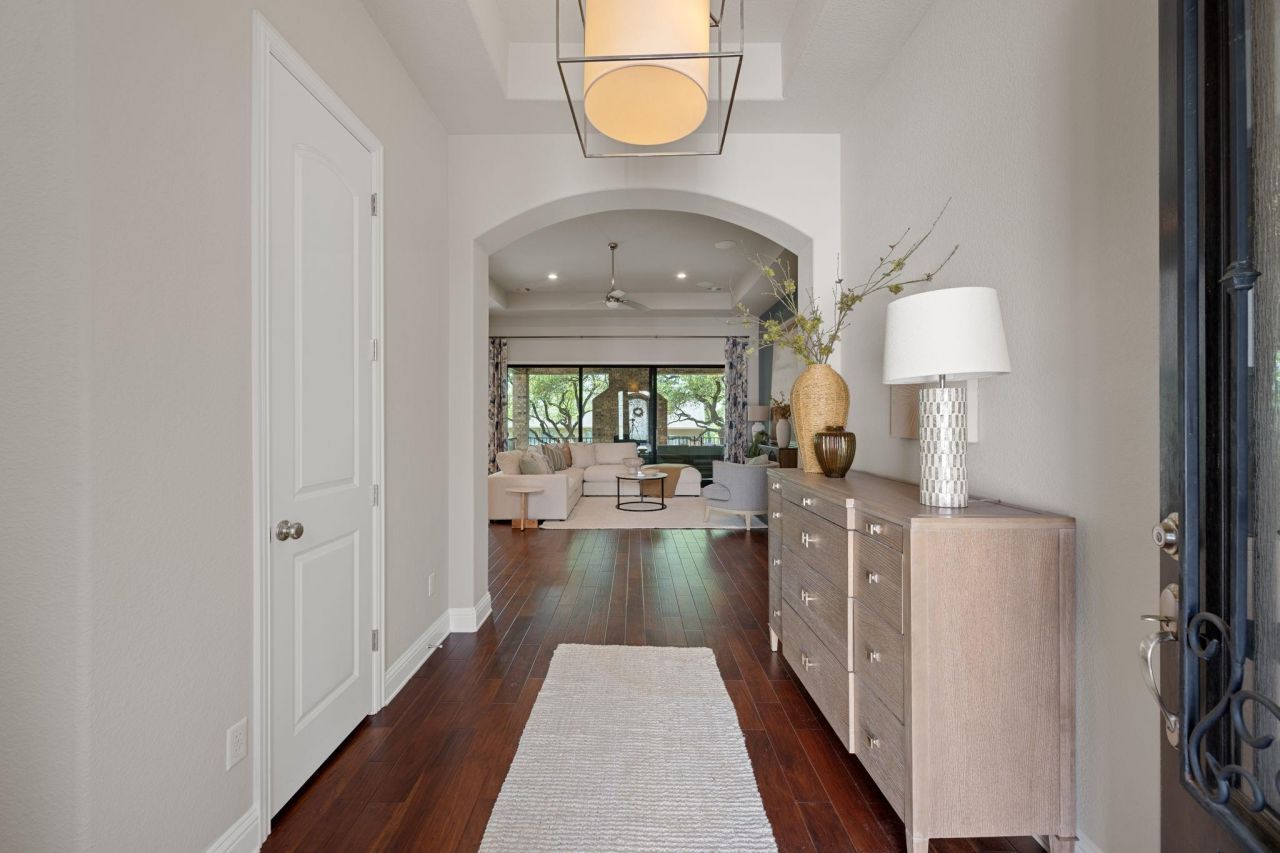 Step through the private courtyard and into this semi-custom home where a dramatic 15-foot sliding glass door opens to a covered patio, framed by mature live oaks, featuring a fireplace, mounted TV, speakers, and stamped concrete. Located in the conservation community of Water Oak at San Gabriel, this upgraded 4-bedroom, 3-bath home with a dedicated office sits on a spacious .23-acre lot and offers a rare blend of privacy, flexibility, and connection to nature. The open concept layout features a bright living space that flows into a chef's kitchen with a large granite island, premium appliances, designer lighting, and abundant storage. A dedicated office with built-ins plus a bedroom with double doors provides flexibility for a second office, library, or guest space. The private primary suite includes dual vanities, an oversized walk-in shower, and a custom walk through closet with direct laundry access. Secondary bedrooms are positioned on the opposite side of the home, and a separate casita with full bath offers an ideal setup for guests or multigenerational living. Additional features include a 3-car extended garage with epoxy floors, overhead storage, smart home integration, and whole-home surge protection. A rare opportunity for eligible buyers, the existing 2.25% mortgage may be assumable for qualified VA buyers with entitlement. Amenities include community center, pool, pavilion, trails, dog park, kid's playground, and San Gabriel River access, with future improvements enhancing connectivity.