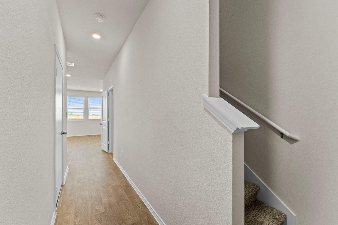 Introducing the Robin floorplan at Bollinger in Maxwell, Texas. This two-story home is perfect for first time homeowners or smaller families. Featuring 2 bedrooms and 2.5 bathrooms, this home also includes a 1-car garage all within 1,130 square feet. Our homes in Bollinger feature our modern farmhouse exterior and the Robin floorplan is available in 2 exterior options. Stepping inside the home from the covered front porch, youll enter a long foyer that leads into the heart of the home, the open concept living space. This cozy area of the kitchen, dining and family room makes cooking and entertaining enjoyable for everyone. The kitchen features laminate countertops with 50/50 stainless steel drop-in bowl, 4 laminate backsplash, 36 upper cabinets and stainless-steel appliances, including a gas range. The pantry and powder room are off the kitchen to complete this downstairs space. Ascending the stairs, youll find the primary bedroom with an attached bathroom. This space will become your retreat at the end of the day. The bathroom features a walk-in shower, laminate countertop, and a walk-in closet. Outside the primary bedroom is the utility room, making your laundry chores easy to complete. Moving down the hall towards the front of the house, youll discover the secondary bathroom and bedroom. Bath 2 includes a shower/tub combination. The Robin includes vinyl flooring throughout the common areas of the home, and carpet in the bedrooms. All our new homes feature Bermuda sod, an irrigation system in the front and back yard, and a 6 privacy fence around the back yard. This home comes with our Americas Smart Home base package, which includes the Amazon Echo Pop, Front Doorbell, Front Door Deadbolt Lock, Home Hub, Thermostat, and Deako Smart Switches.