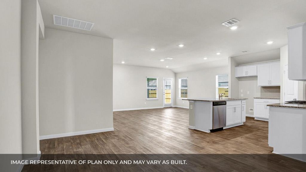 ESTIMATED COMPLETION JUNE. Images representative of plan only and may vary when built. The Lakeway is a single-story home that offers 2,109 square feet of living space in our Thunder Rock community located in Marble Falls, TX. The Lakeway is the perfect family homing featuring a two-car garage, four bedrooms, three bathrooms and a study. As you enter the home you will find yourself in a foyer that opens to a spare bedroom, a bathroom and a large study with an extra closet for storage. As you continue through the home you will walk into the spacious dining room, kitchen and open living room that leads to a covered patio. The kitchen features a large kitchen island, quartz countertops, a large pantry and stainless-steel appliances throughout. Just off the dining room is the third and fourth extra bedrooms as well as the third bathroom. At the back of the home, just off the living room, is the main bedroom, bedroom 1. This bedroom features plenty of space and natural lighting, a large ensuite with double vanity and a large walk-in closet. This home comes included with a professionally designed landscape package and a full irrigation system as well as our America's Smart Home® package that offers devices such as the Qolsys IQ Panel, Video Doorbell, Alarm.com app, Honeywell Thermostat, Deako Smart Light Switch, Kwikset Smart lock, and more.