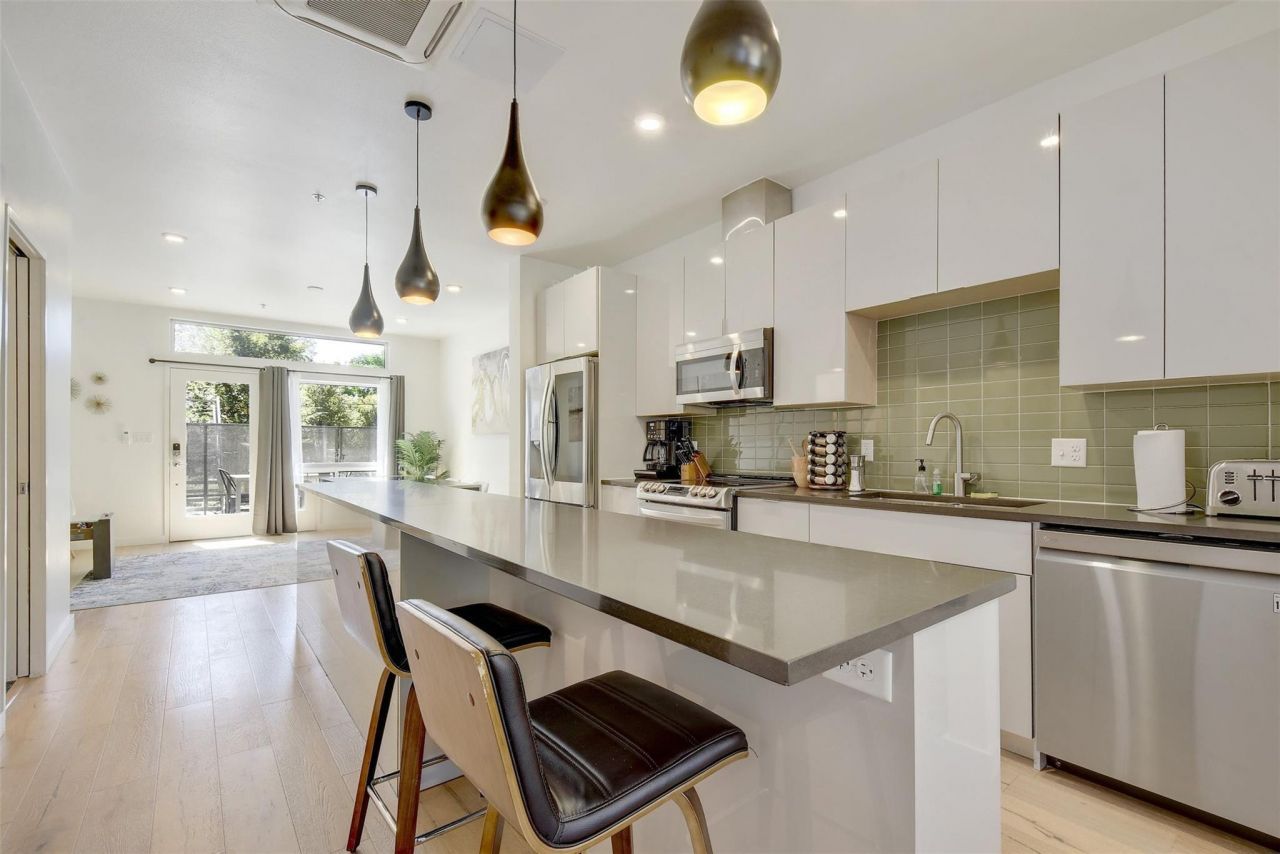 Located in the vibrant heart of East Austin, this newly constructed 3-bedroom, 2.5-bath modern condo delivers easy, elevated urban living. Designed with clean lines and high-end finishes throughout, the home features hardwood floors, abundant natural light, and a thoughtfully designed layout that feels both stylish and functional.The main living area is bright and open, with separate dining and living spaces framed by large windows. The kitchen is a standout, featuring white cabinetry, stainless steel appliances, and a center island with bar seating, perfect for casual meals or entertaining. Upstairs, the spacious primary suite offers a private retreat with an ensuite bath and double vanities, while two additional bedrooms provide flexibility for guests, work-from-home, or both.Take in stunning downtown Austin views from the third-level patio, or unwind in your own private courtyard complete with a BBQ grill, ideal for hosting or just enjoying a quiet evening outside. With two dedicated parking spaces, convenience is built right in. This is a rare opportunity to enjoy modern design, indoor-outdoor living, and unbeatable location all in one. Reach out today to schedule a private tour and see it for yourself.