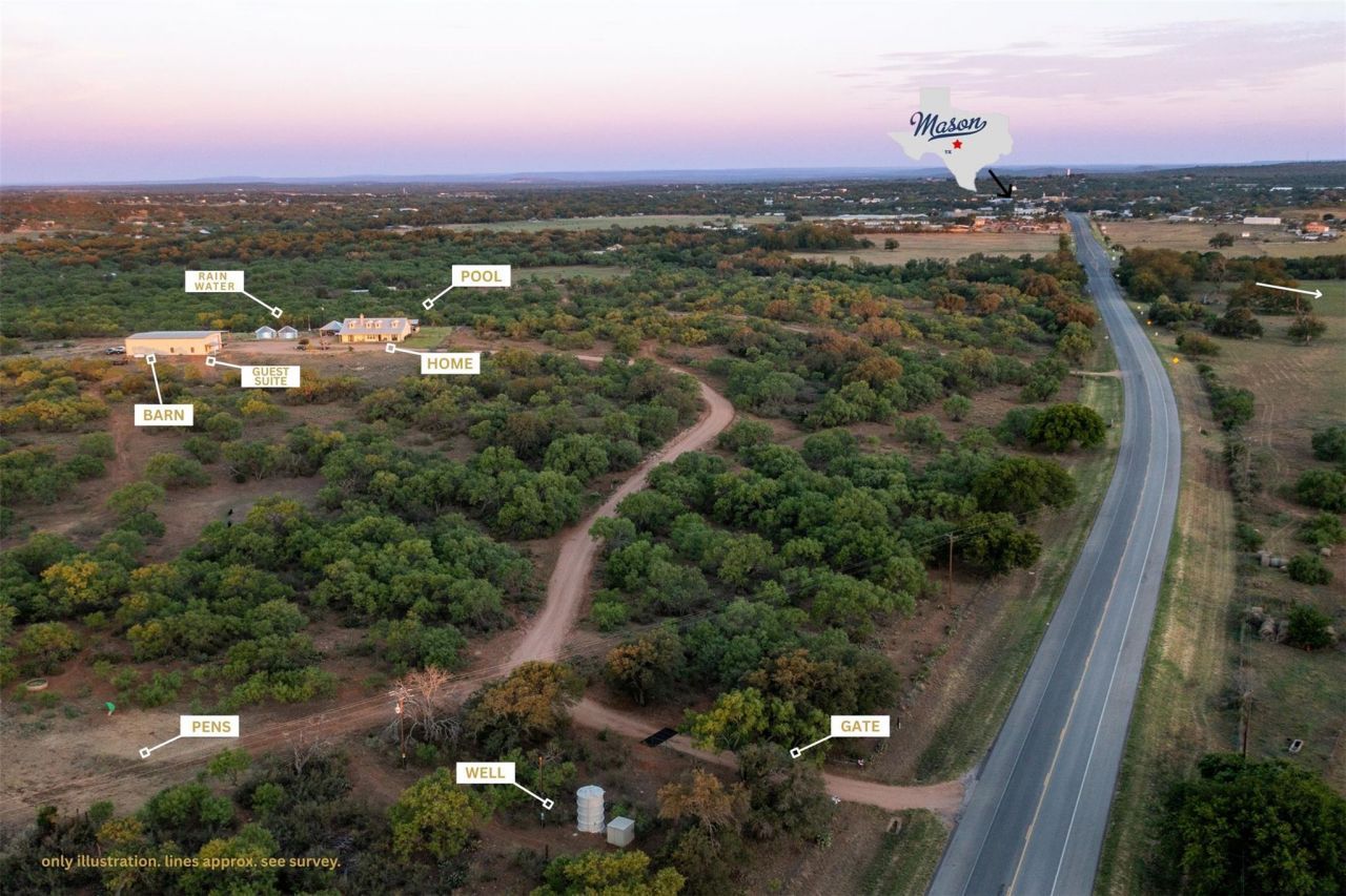 Red Fox Ridge Ranch is a rare 120 acre Hill Country offering just 0.4 miles from Mason, Texas, combining luxury improvements, recreational appeal, and exceptional convenience. One of the larger tracts this close to town, the ranch is only about 1.5 miles from the historic Mason Square, giving owners quick access to dining, shopping, and small-town charm while still enjoying the privacy and freedom of ranch living. At the center of the property is a beautifully maintained 3,000 sq. ft. 3-bedroom, 2-bath limestone home designed with timeless Hill Country style and comfort in mind. Interior features include an open-concept layout, expansive kitchen with granite countertops and stainless appliances, grand stone fireplace, custom cabinetry, repurposed timber accents, mudroom, upgraded laundry room, full-home LED lighting, and a vertical wine cooler. Outside, a Keith Zars custom pool and spa with waterfall, outdoor cooking station, and flagstone decking create an ideal setting for entertaining and relaxation. Tiff-Tuff Hybrid Bermuda grass adds a clean, low-water landscape around the home. A major highlight is the dedicated fiber optic line through Masons fiber service, a rare amenity outside the city limits, with up to 1000 Mbps internet available. The ranch also features a 4,000 sq. ft. insulated barn with four RV-size overhead doors, loft storage, large overhang, LED lighting, and a 1-bed, 1-bath guest suite with full kitchen, living area, utilities, and fiber internet. Additional improvements include fruit trees, grapevines, a regulation-quality skeet and trap field with Lincoln commercial machines, three ponds, and a portion of Comanche Creek along the back of the ranch. Water resources include a reported 10.5+ GPM well and a rainwater collection system with filtration and 37,600 gallons of storage. Ag exempt. Red Fox Ridge Ranch is a turnkey Mason County property with comfort, recreation, and investment appeal.