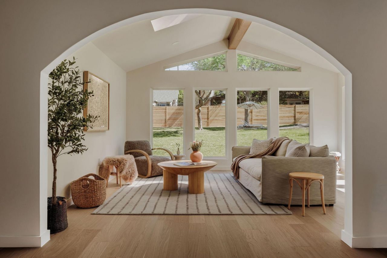 A beautifully restored mid-century modern home offers a rare blend of timeless architecture and thoughtful, high-end finishes by Silver Homes . :: Bright, open, and extremely spacious, the main living area is accented by vaulted ceilings, a cozy stucco fireplace, and engineered hardwood floors that flow throughout, with an adjoining family room as well as formal dining. :: The kitchen is a chef's dream, featuring quartz countertops, new solid wood cabinetry with custom fixtures and green smoke by farrow and ball, white oak floating shelves, full appliance suite, and wine refrigerator. :: Just upstairs the primary bedroom features a massive walk-in closet with an abundance of shelving and storage options. :: Ensuite bathroom showcases designer terrazzo tiles + plaster, a spa-like walk-in shower with waterfall shower head, and soaking tub. :: This home is extremely versatile, with multiple bedrooms, a home office, and a laundry room that doubles as a mud room. :: Just through the french doors is a sprawling backyard oasis, complete with an oversized deck and full $40K+ pool restoration plus equipment by PoolSmart, enclosed by a new 8 foot cedar fence for ultimate privacy. :: Systems upgrades include new overhead water lines + fixtures + water heater (all PVC plumbing under slab), new electrical system (full rewire + panel etc. + trim out), new flex ducting + insulation (Both HVAC systems 2-3 years old), new 30-year arch roof, new sod & irrigation. :: Just minutes to H-E-B, Armadillo Den, and beautiful parks + nature preserves.