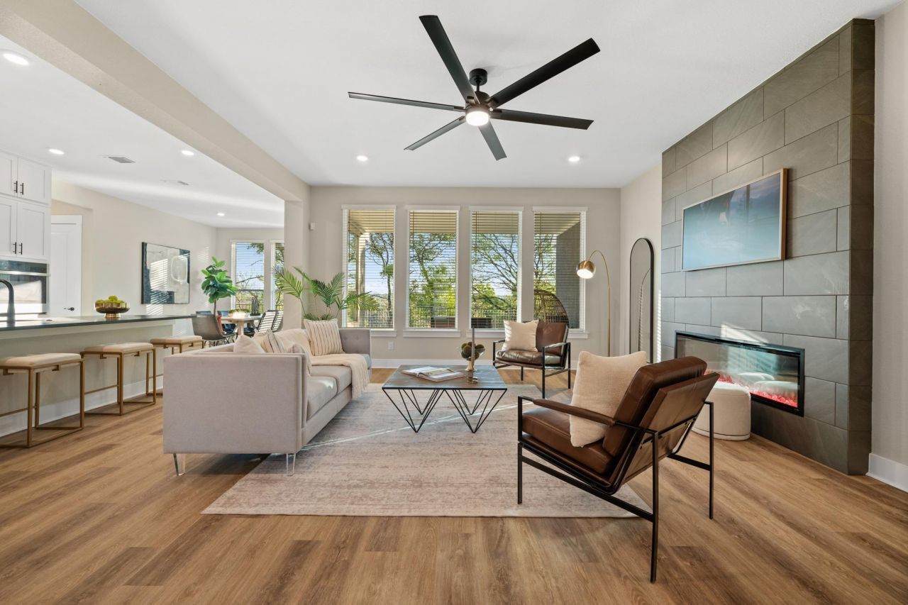 Situated on a private cul-de-sac in the exclusive Woodlands section of Bryson?comprised of only 14 homes?this property offers a level of space and privacy rarely found within a master-planned community. Set on approximately 0.70 acres, the homesite extends beyond the traditional backyard and includes OWNERSHIP of the natural ravine below. Mature trees, preserved green space, and frequent deer sightings create a setting that feels tucked away while still connected to the neighborhood.Built in 2024 by Chesmar Homes, this two-story home has unique features throughout. The southeast-facing orientation allows for consistent natural light throughout the day, plus those cool Summer nights. One of the standout features is the rare half-circle driveway (the ONLY one in Bryson), paired with a 3-car garage. Inside, expansive windows frame treetop views and bring in natural light in every room. The kitchen stands out with black leathered quartz countertops, white cabinetry, a bold backsplash, built in appliances, and an oversized island that opens seamlessly to the living and dining spaces. A dedicated study and upstairs game room provide flexibility for both work and everyday living. The primary suite offers a freestanding soaking tub, walk-in shower, dual vanities, and a spacious walk-in closet. Outdoor living includes a covered patio and second-story balcony overlooking the ravine?ideal for quiet mornings or evenings taking in the views. The backyard offers ample space for customization. Bryson is known for its strong sense of community and well-maintained amenities. Residents enjoy a resort-style pool and splash pad, playground, dog park, fire pit gathering area, miles of private trails, and The Backyard amenity center overlooking a stocked catch-and-release pond.Conveniently located near upcoming commercial developments including Costco, Target, and Walmart, along with easy access to Northline, dining, retail, and the CapMetro Rail Station.