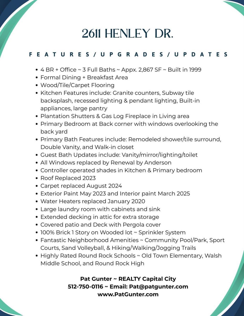 Beautifully maintained one-story home offers 4 bedrooms + a dedicated office, 3 full baths, and appx 2,867 square feet of thoughtfully designed living space. Elegant wood flooring and plantation shutters enhance the homes timeless appeal, while numerous updates?including windows replaced by Renewal by Andersen, a 2023 roof, recent interior and exterior paint, and water heaters replaced in 2020?provide peace of mind. The spacious kitchen is perfect for entertaining, featuring granite countertops, recessed lighting, and built-in appliances. The living area has a gas log fireplace and built-in cabinetry. The primary suite offers a remodeled shower & tile surround, double vanity, and generous walk-in closet. Step outside to enjoy a private backyard complete with a covered patio, covered pergola, mature trees, and lush landscaping?ideal for relaxing or hosting gatherings. Located within highly acclaimed Round Rock ISD?Old Town Elementary, Walsh Middle, and Round Rock High?this home also provides access to wonderful community amenities, including a park, pool, sports courts, and hike/bike trails. Conveniently situated near dining, shopping, and major roadways, this home truly has it all.