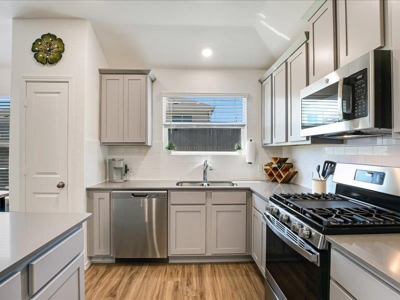 The primary suite offers a private and relaxing retreat with a well-appointed bath and generous walk-in closet, while the secondary bedrooms provide flexibility for guests, a home office, or additional living needs. The home presents a modern, updated feel while still offering a versatile canvas for a buyer to make it their own.Step outside to a covered patio and an expansive backyard that truly sets this property apart. Thoughtful landscaping enhancements include added plant beds, rose bushes, Vitex, cherry laurel, and a magnolia tree, creating a lush and inviting outdoor setting. A privacy lattice adds charm and seclusion, while the spacious yard offers endless possibilities for recreation, entertaining, or simply enjoying beautiful sunset views. A storage shed provides added convenience for tools, equipment, or hobbies.The neighborhood enhances the lifestyle even further, featuring walking trails, convenient access to grocery stores and shopping, and community events throughout the year that bring neighbors together with food, music, and activities. Residents also enjoy access to a clubhouse, pool, playground, picnic areas, and a volleyball court, offering a variety of options for recreation and relaxation.With its balance of modern design, inviting atmosphere, and exceptional indoor and outdoor living, this home is perfectly suited for those who value comfort, connection, and the opportunity to create something truly their own.