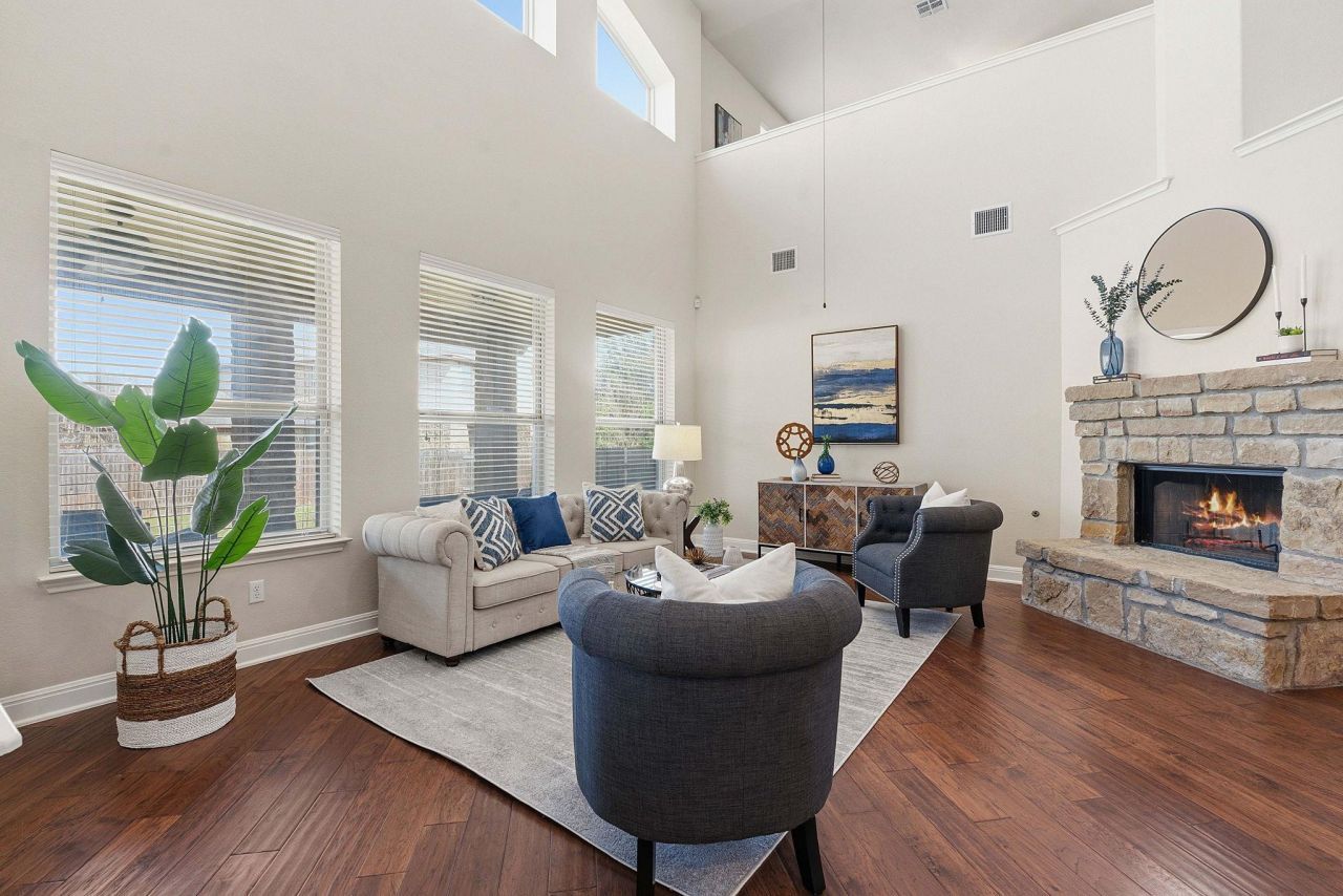 Heres your opportunity to own a stunning two-story stone residence in the highly desirable Ranch at Brushy Creek community. This beautifully designed home offers 5 beds, 3.5 baths, a dedicated home office, formal dining room, upstairs game room, a private theater room and a 3-car garage?providing exceptional space for both everyday living and entertaining. Step inside to discover an open, light-filled floor plan highlighted by soaring 2-story ceilings in the living room, expansive windows, and rich hardwood flooring. Thoughtful upgrades throughout include plantation shutters, high-end finishes, new carpet, recent interior paint and a new roof scheduled for completion prior to closing. At the front of the home, a private office with double doors offers the ideal space for remote work. The chefs kitchen serves as the heart of the home, featuring Silestone countertops, center island, stainless steel appliances with vent hood, 42-inch cabinetry, a walk-in pantry, and breakfast bar seating that flows seamlessly into the living area. Just off the breakfast room, an oversized covered patio invites you to relax or entertain outdoors. The spacious backyard, 0.256 acre, offers room for a future pool and endless possibilities for creating your own outdoor retreat. The open-concept living room features hardwood floors, dramatic double-height ceilings, large windows, and a cozy fireplace. The main-level primary suite is a true retreat, complete with a bay window and an upgraded spa-like bath with a walk-in shower, soaking tub, dual vanities, and generous walk-in closets. Upstairs, a bright flex space provides the perfect setting for a game room or workout area. 4 Spacious secondary bedrooms and 2 full baths complete the upper level. Ideally located minutes from top-rated Round Rock ISD schools, BC Regional Trail, major tech employers including Apple and Amazon, plus abundant shopping and dining. Residents enjoy 2 community pools, parks, and scenic walking trails.