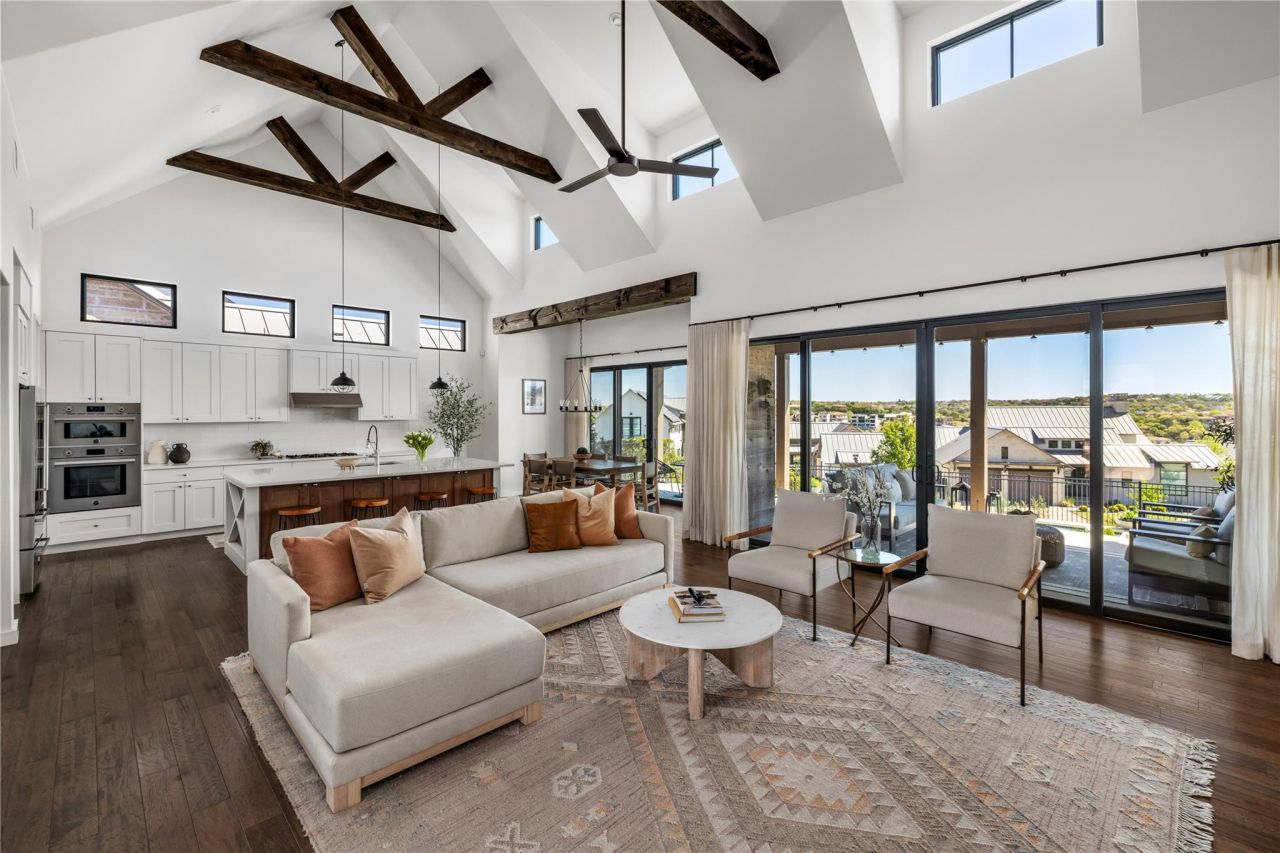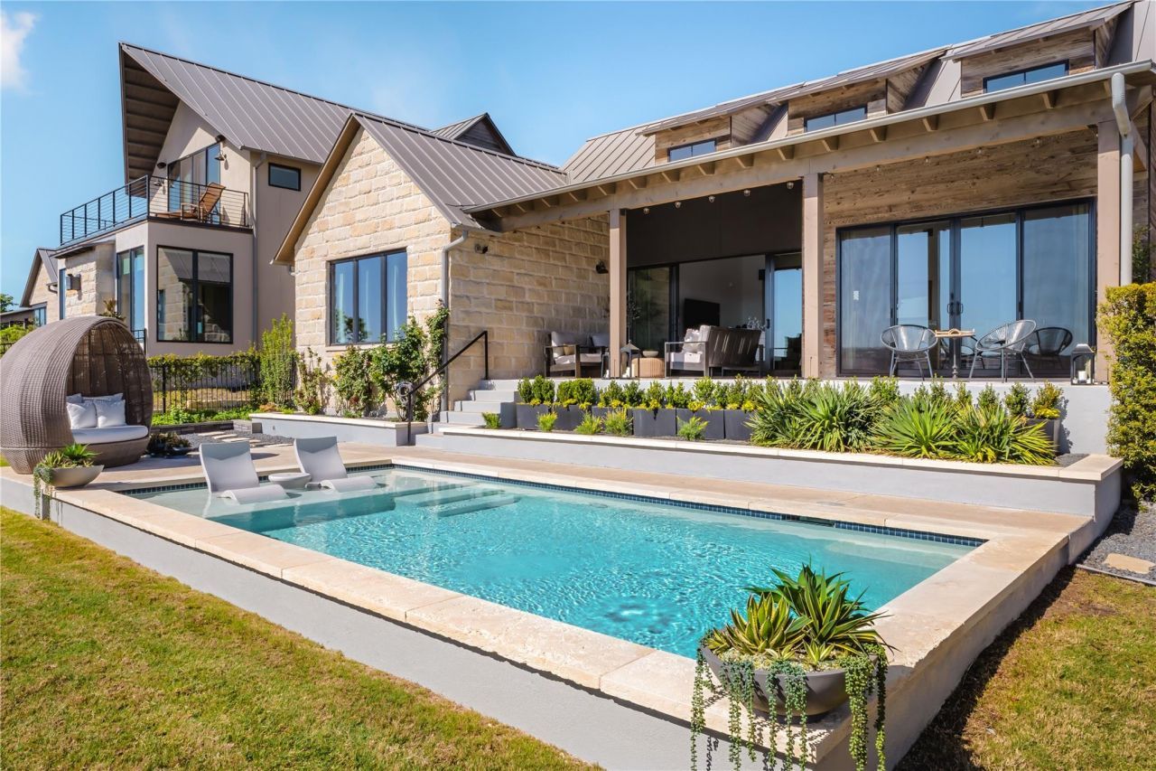 Beautifully crafted one-story Modern Farmhouse tucked within the prestigious, concierge-tended Westside Landing at The Peninsula at Rough Hollow. This exclusive enclave is known for its exceptional construction, green energy standards, and effortless lock-and-leave lifestyle. With three bedrooms, two full baths, and one half bath across 2,151 square feet, every space is thoughtfully scaled for comfort, style, and easy living. Built in 2019, the home blends warm contemporary finishes with a bright pavilion-style floor plan, expansive windows, and soaring 20-foot wood-beamed cathedral ceilings that fill the living spaces with natural light. The kitchen features custom cabinetry, Bertazzoni stainless steel appliances, gas cooking, and an easy flow for both everyday living and entertaining. Andersen windows and sliding glass doors open to an expansive covered patio overlooking the sparkling pool, with sweeping east-facing Hill Country views and cooling breezes. Tankless hot water, 8-foot solid wood doors, custom closet built-ins, sound-insulated bathrooms, a water softening system, and custom garage storage all reflect the home's quality and livability. HOA-maintained common and private grounds make for a truly effortless lock-and-leave lifestyle. Set within Lake Travis ISD and moments from the Hill Country Galleria, Rough Hollow offers a lifestyle that feels like a permanent escape. Residents enjoy exclusive access to a breathtaking infinity pool overlooking Lake Travis, a serene adult pool, a winding lazy river, and a world-class fitness center. Miles of wooded hiking trails wind through the neighborhood, including a private path leading directly to the Lake Travis shoreline and kayak house. Pickleball courts, a vibrant marina, and the iconic Canyon Grille, perched above the Rough Hollow Yacht Club with coveted boat and jet-ski slips, complete a community where the best of lake living is always within reach.