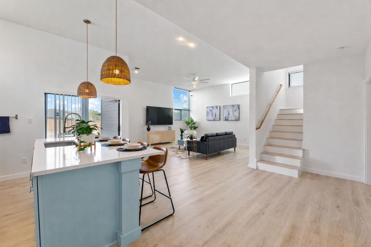 Modern Agave living with downtown-sunset views and greenway privacy.Set in one of East Austins most aesthetically distinctive neighborhoods, this residence blends modern architecture with a long list of upgrades and an airy layout. The main level is anchored by a bright, open-concept living, dining, and kitchen space with high ceilings and large picture windows. The kitchen makes a statement with recently painted moonmist blue cabinetry, complemented by quartz countertops, a built-in cabinet pantry, and a large island with breakfast bar?all set against waterproof oak-toned flooring that runs throughout for a warm, cohesive finish. That same misty blue update continues in two bathroom vanities, adding a consistent designer touch. A rare and valuable layout feature: each bedroom has its own bathroom, creating true privacy for guests, roommates, or flexible work-from-home living. Upstairs, the primary suite is a showstopper?step onto your covered balcony for sweeping views of downtown Austin and sunsets. The fully updated primary bath delivers spa energy with a modern soaking tub/shower with sliding glass door, & double vanity Outside, enjoy a welcoming front porch, a covered back patio, and a large backyard with direct access to a greenway easement. Additional exterior perks include a storage shed, multi-car driveway/carport, and walking pavers for easy flow. Agaves amenities include a two-way bike lane, shaded playground, BBQ grills, and picnic pavilion. Close access to the Walnut Creek trailhead. Conveniently located just minutes from downtown Austin, ABIA, and major highways including 183, 130, and 290.