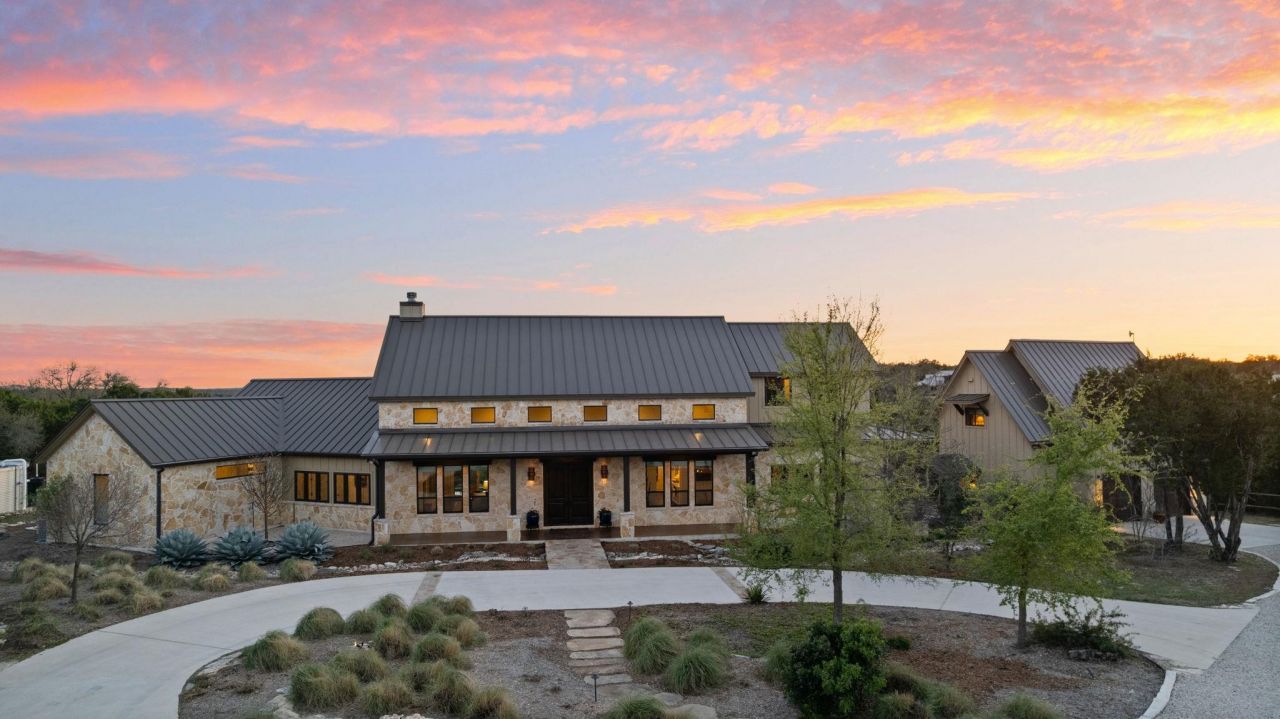 Discover the beauty of this thoughtfully designed home, ideally situated to capture the scenic allure of the Texas Hill Country. Offering breathtaking, unobstructed views, this home is crafted with an emphasis on privacy and hospitality. The layout features an expansive open kitchen, dining, and great room, which serve as a natural gathering spot for family and friends. Surrounding the heart of the home at one end is a spacious master suite with a pocket office, and on the opposite end, a generous guest suite which opens on to the outdoor living space complete with a kiva fireplace and views of the pool and valley. The second floor includes a third bedroom and bath as well as a bonus room with a spectacular view, which could be used as a study, game room, or a fourth bedroom. Additionally, the property includes an attractive and inviting guest house featuring 1 bedroom, 1 bath, a kitchen, and a deck with scenic views?perfect for hosting guests.Emphasizing sustainability, this property boasts eco-friendly rainwater collection and a water well. Additionally, a privately owned solar system provides cost effective and reliable energy. The north-facing orientation combined with thick insulation ensures year-round comfort throughout every season.Ideally located within the friendly Mustang Valley community, you'll enjoy access to nearby lake and park areas, enhancing your lifestyle with outdoor activities and social opportunities. Mustang Valleys dark sky emphasis means you can the relish clear, starry nights. The acreage is ag-exempt, providing open space and lower taxes. Adjoining unimproved Lot 36 is available separately (ABOR MLS #2768701) or additionally with subject property for a total 18+/- acres with lakefront.This inviting home harmoniously blends comfort, sustainability, and community, making it an exceptional choice for those seeking a peaceful Texas Hill Country retreat. Dont miss your chance to call this captivating property your own!