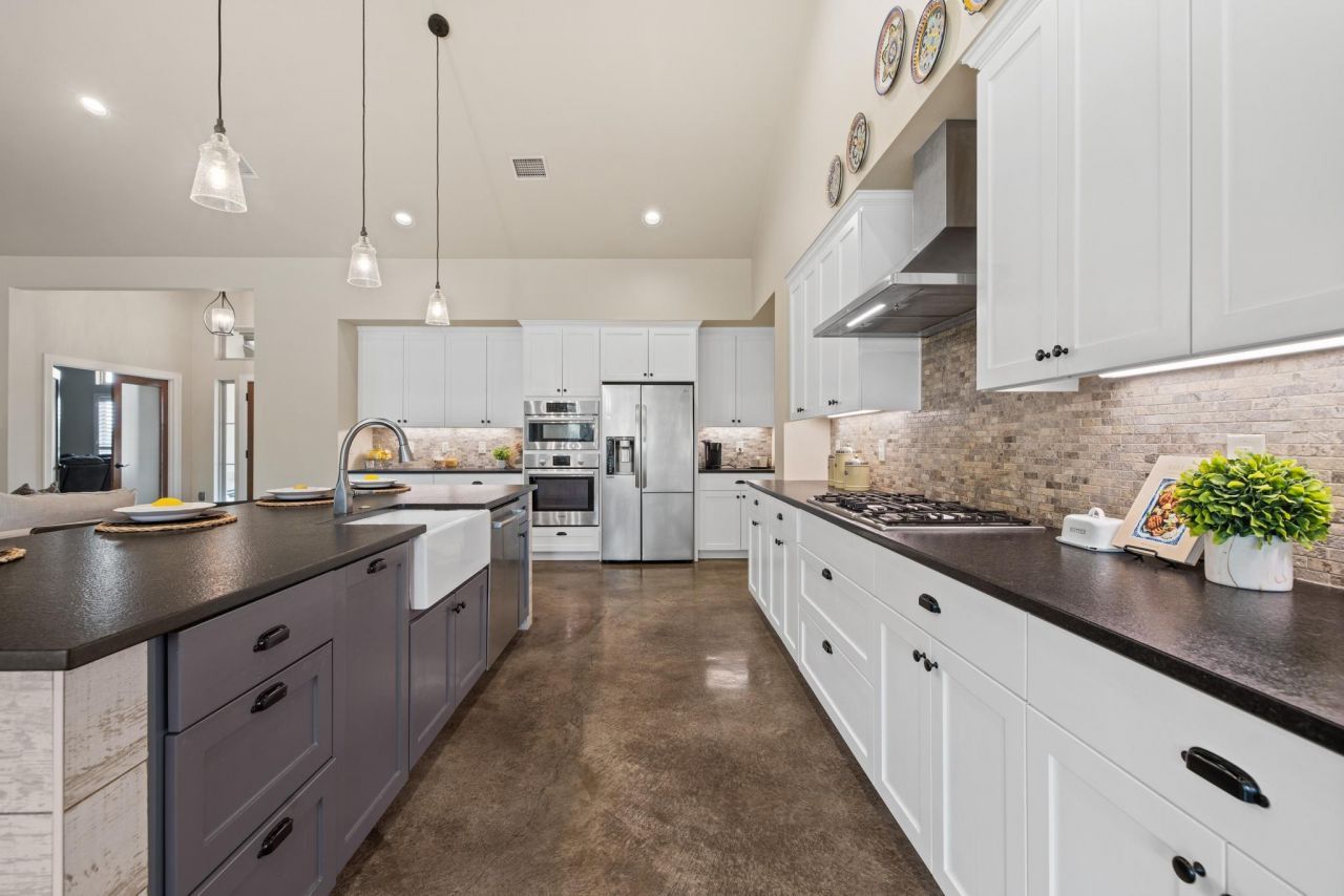 Set on a heavily treed one-acre lot with over 50 mature oak trees, this custom home by Riata Builders offers privacy, quality construction, and a thoughtfully designed floor plan. Each bedroom features its own ensuite bathroom, complemented by a separate powder bath for guests. The open kitchen and family room create an inviting central living space and feature leathered granite countertops, shaker-style cabinetry, a gas range with vent hood, and upgraded Bosch appliances. Upgrades include plantation shutters, vaulted ceilings with beams, tons of built-in cabinetry, and a gas fireplace. An additional flex space provides the option for a game room, media room, or home office. The fenced and cross fenced backyard and expansive oak canopy offer a private outdoor setting ideal for entertaining or quiet relaxation. Located less than three miles from Jim Hogg Park at Lake Georgetown, with convenient access to fishing, swimming, a public boat ramp, and over 26 miles of scenic hiking and biking along the Goodwater Trail. This area is deed restricted, with no HOA and a lower tax rate!